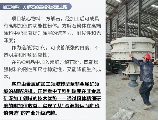 在國家大力推進新型工業(yè)、加快發(fā)展新質(zhì)生產(chǎn)力的戰(zhàn)略背景下,非金屬礦加工行業(yè)正迎來智能化、綠色化、高端化轉(zhuǎn)型的窗口期。隨著《"十四五"原材料工業(yè)發(fā)展規(guī)劃》對非金屬礦物材料產(chǎn)業(yè)高質(zhì)量發(fā)展的明確指引,以及高端制造業(yè)對超細(xì)粉體材料需求的持續(xù)攀升,行業(yè)已從傳統(tǒng)加工模式向"精細(xì)化、功能化、集群化"發(fā)展階段加速邁進。作為非金屬礦加工領(lǐng)域的重要技術(shù)參與者,科利瑞克深度參與的福建方解石制粉項目,正是這一區(qū)域性變革項目的落地,該省級示范工程——不僅填補了福建區(qū)域性自造高端方解石粉體生產(chǎn)的空白,更通過"設(shè)備集群+智能工藝+綠色布局"的創(chuàng)新模式,為非金屬礦行業(yè)轉(zhuǎn)型升級提供了可復(fù)制的解決方案。